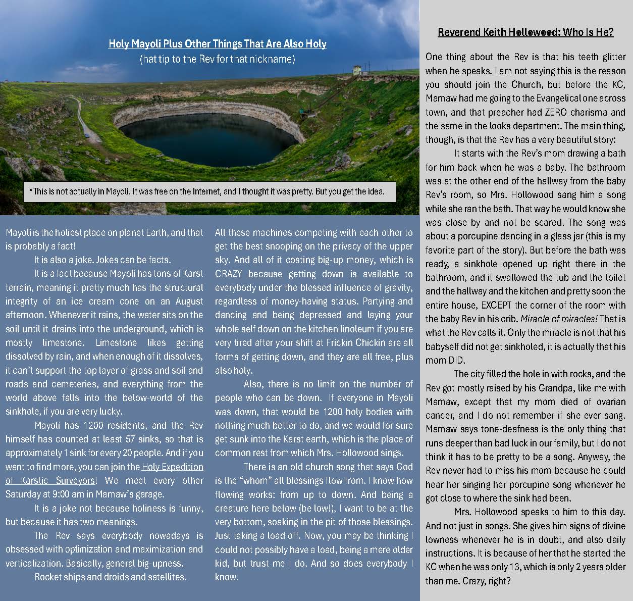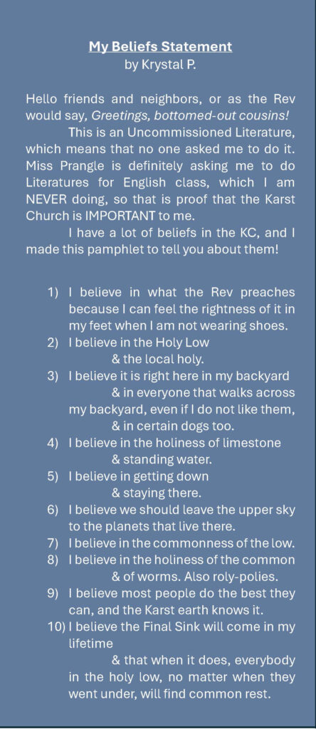 This is an Uncommissioned Literature, which means that no one asked me to do it. Miss Prangle is definitely asking me to do Literatures for English class, which I am NEVER doing, so that is proof that the Karst Church is IMPORTANT to me. I have a lot of beliefs in the KC, and I made this pamphlet to tell you about them!