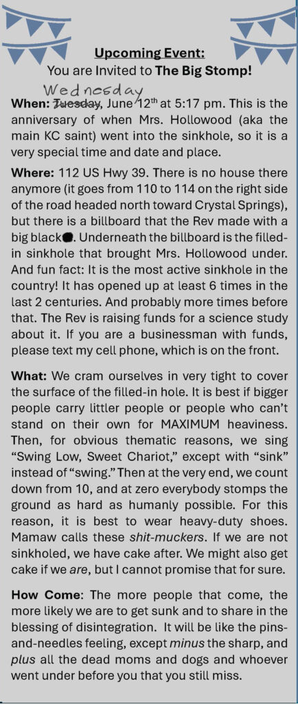 Hello friends and neighbors, or as the Rev would say, Greetings, bottomed-out cousins!